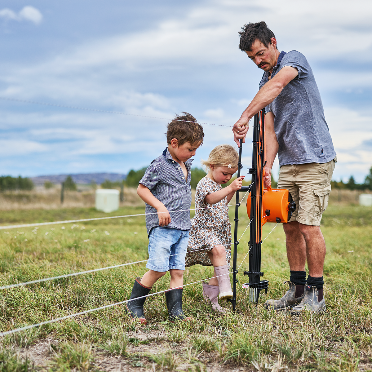 Simplemente coloque el poste final en el suelo y desenrolle cuatro cables simultáneamente mientras coloca cada poste restante. Le permite crear rápidamente un corral portátil o un área de pastoreo segura al costado del camino.