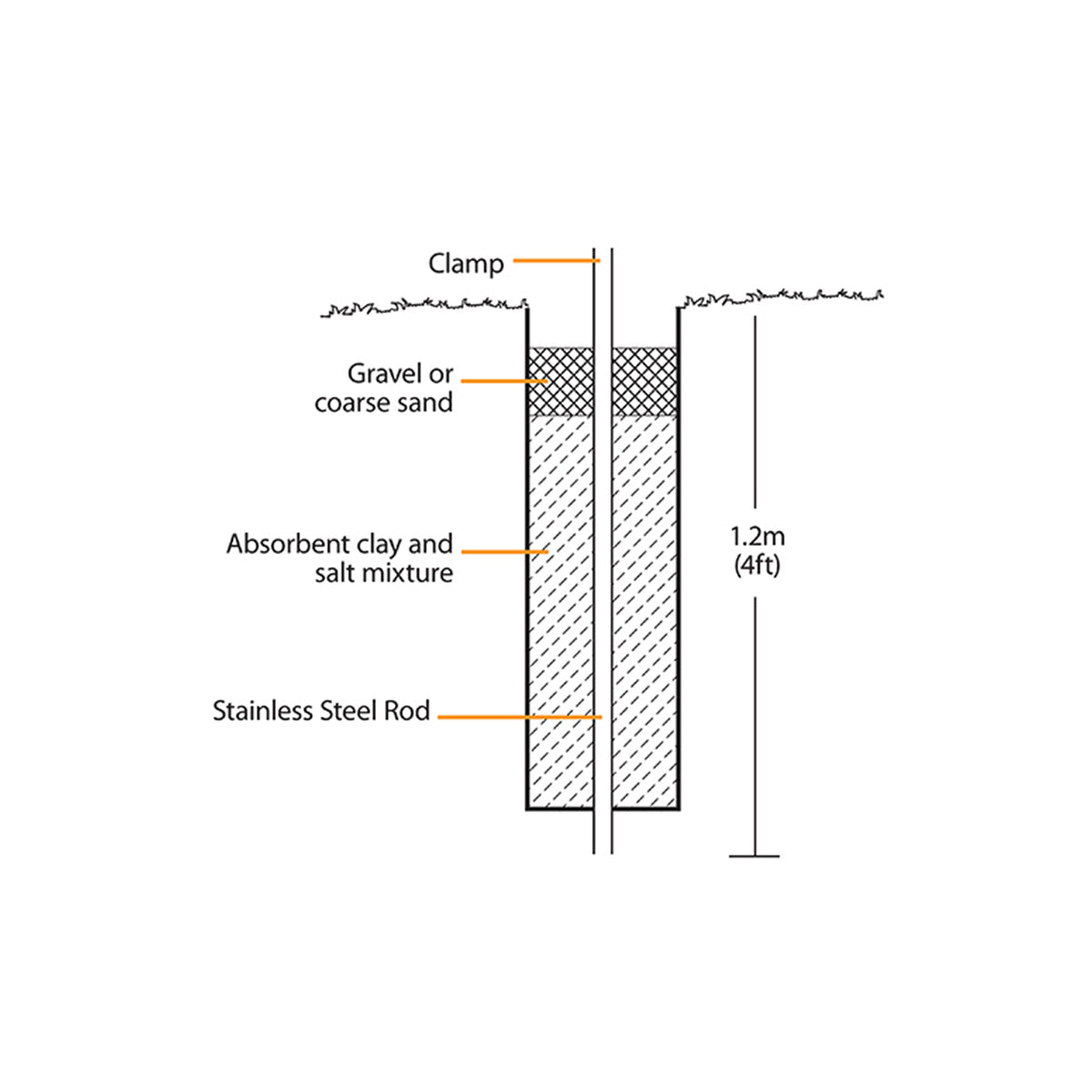 Opción de puesta a tierra recomendada: equivale a tres estacas de conexión a tierra. Particularmente eficaz en suelos que no favorecen la puesta a tierra.